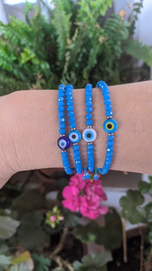 This bracelet is featuring an evil eye bead and tiny blue rondelle crystal faceted beads. Nice gift for mother’s day, bestfriend, Christmas or birthday.